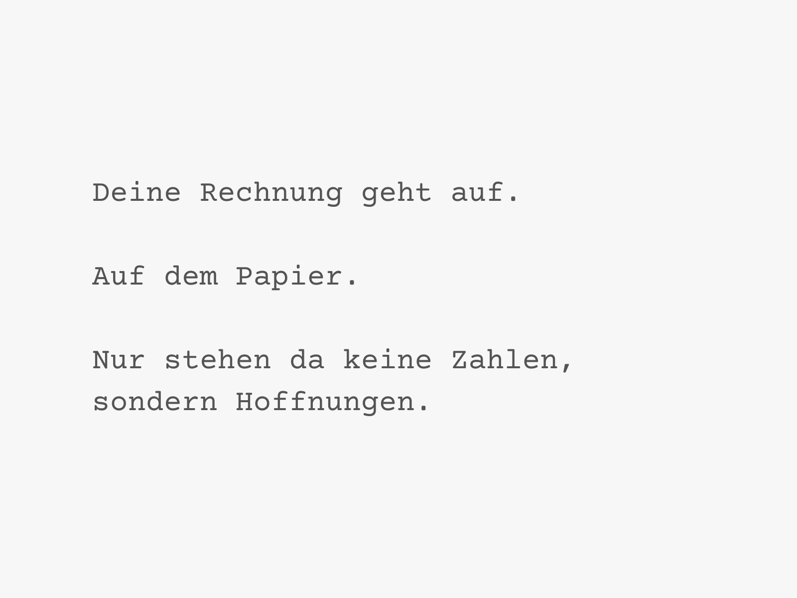 Du hast dieses Polster nicht. Du musst früher wissen, ob es trägt, weil du dir monatelange Irrwege nicht leisten kannst. Und du bist auch kein Portfolio. Du bist einfach nur du. Du hast keine 10 Schüsse frei.